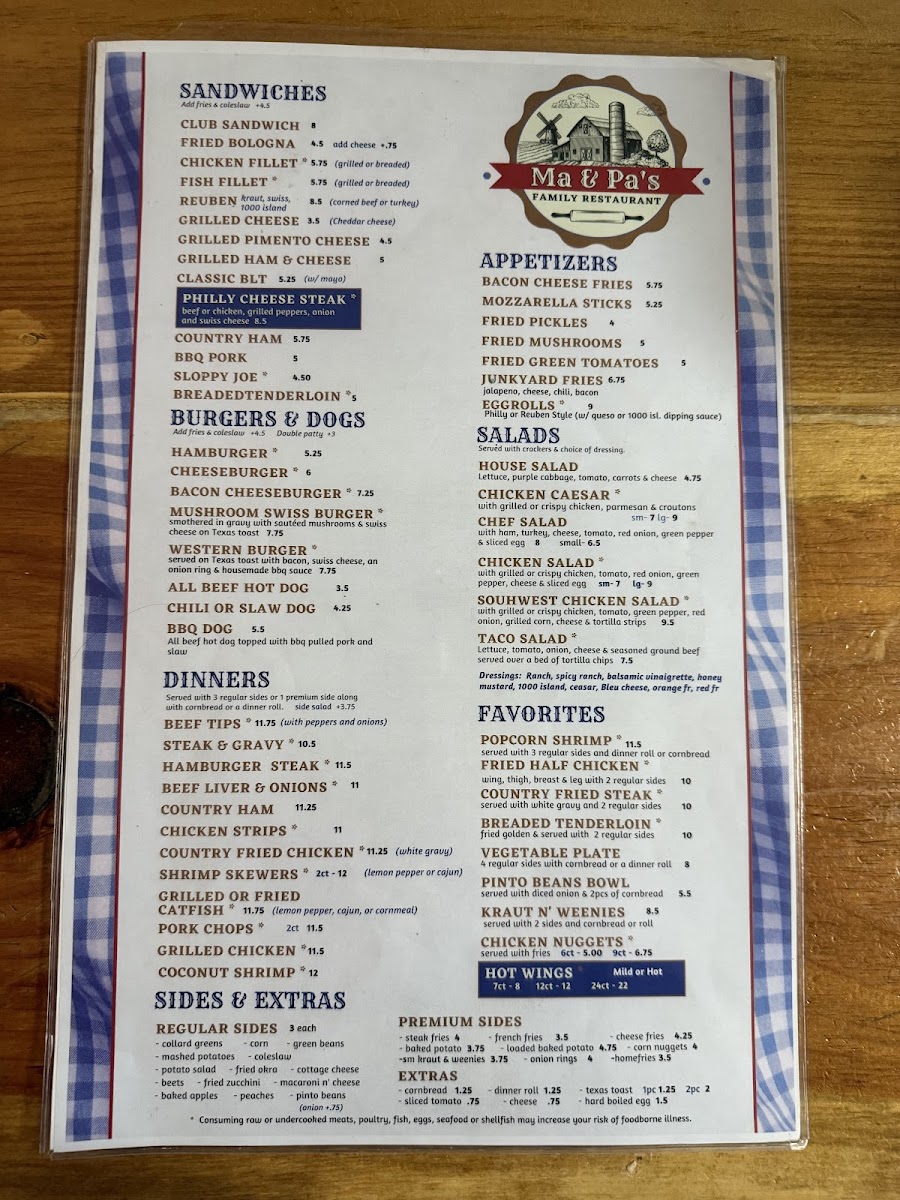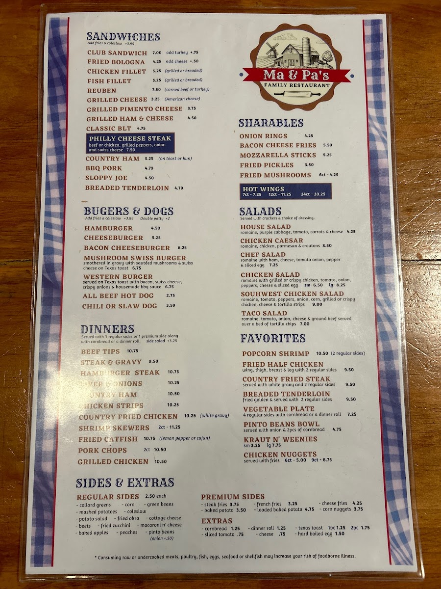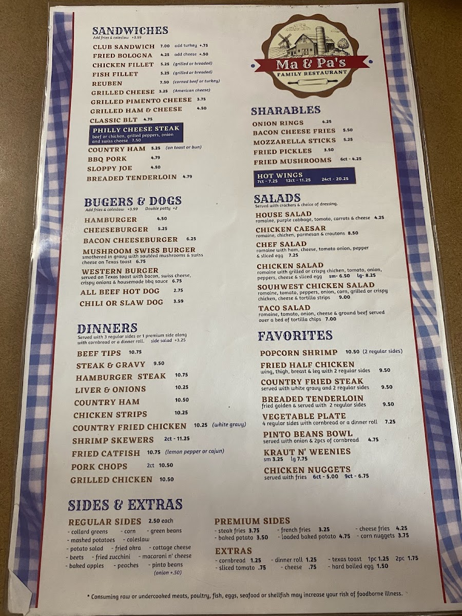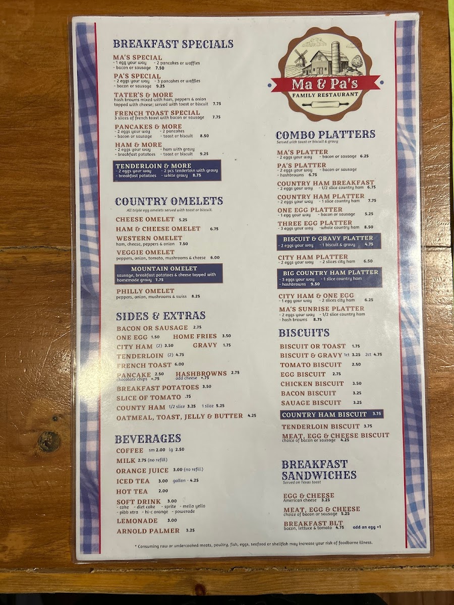 Ma & Pa's Restaurant offers a warm and straightforward menu reflective of classic family dining in East Tennessee. The menu centers around comforting, hearty dishes that feel right at home whether you're starting your day with a satisfying breakfast or gathering with loved ones for a relaxed lunch or dinner.